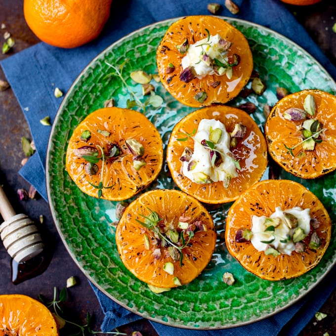 Clementinas glaseadas con azúcar morena con queso crema, miel y pistachos