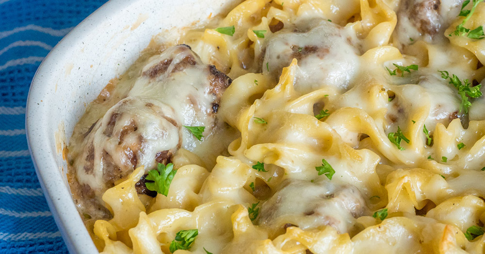 ¿A quién de nosotros no le gustan las albóndigas suecas? No es que la albóndiga en sí sea tan única (excepto quizás el hecho de que generalmente se cubre con nuez moscada en lugar de albahaca y orégano), pero generalmente se sirve en una deliciosa salsa cremosa. Si bien es posible que te gusten servidos con puré de papas, soy fanático de combinarlos con fideos de huevo, y esta cacerola trae toda esa bondad a un plato cocinado.