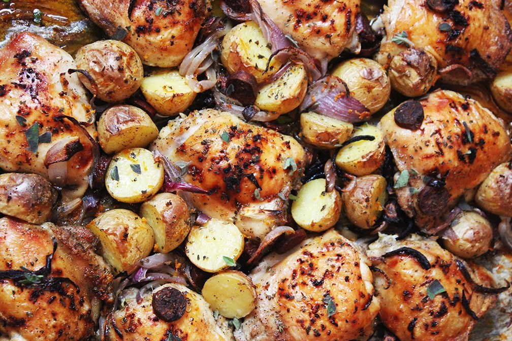 Este pollo en este pan español tiene una piel súper crujiente pero es muy jugoso por dentro. Y las batatas doradas con miel y las cebollas doradas crujientes por los bordes pero muy tiernas. ¡Y es la comida perfecta! ¡No puedo esperar a que lo pruebes y me digas lo que piensas! ¡Se me hace la boca agua solo de escribirlo!