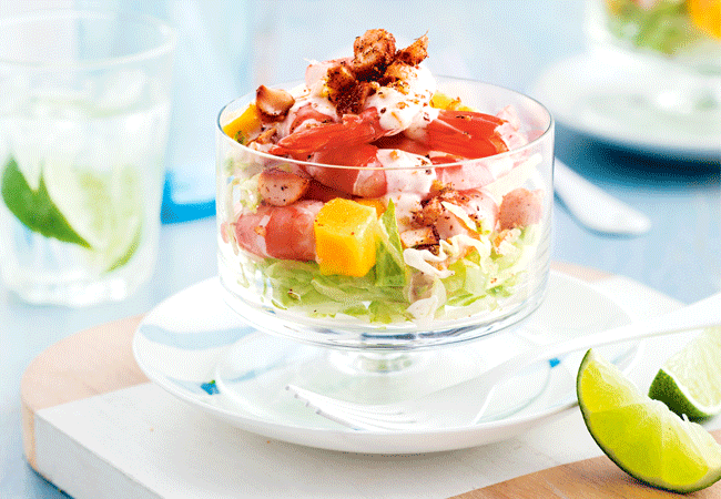 Coloque la lechuga, los camarones y el mango en vasos para servir. Agregue la mezcla de mayonesa. Servir espolvoreado con nueces de macadamia.