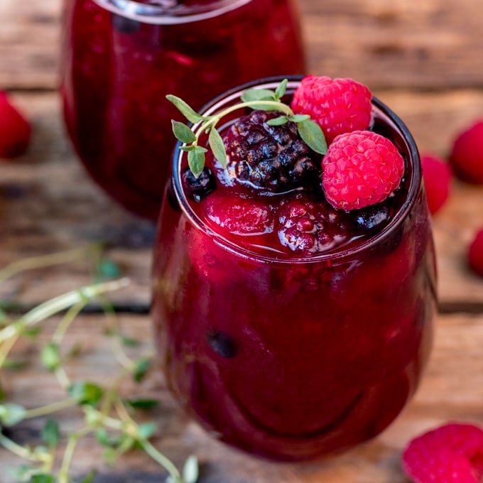 Llena las copas con el cóctel y añade algunas frambuesas frescas y una ramita de tomillo fresco antes de servir.
