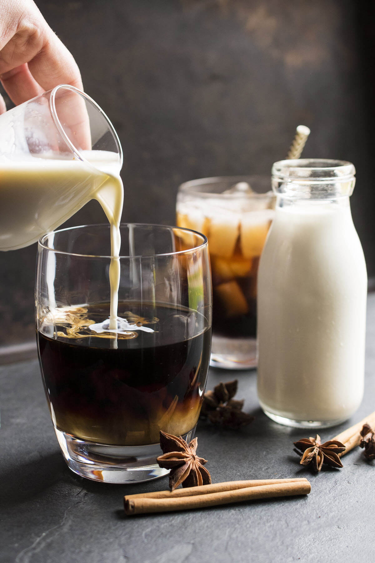 - Para hacer el cóctel, agita el vodka, el licor de café y la crema espesa de chai en una coctelera llena de hielo. Filtrar y verter en 4 vasos llenos de hielo.
