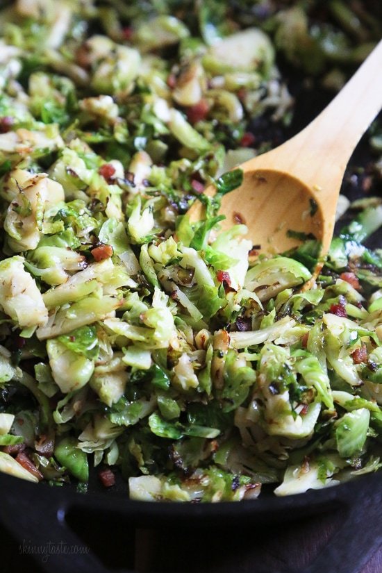 Las coles de Bruselas picadas salteadas con tocino son el la mejor receta de coles de bruselas! Ligeramente fritos en una sartén hasta que estén ligeramente dorados alrededor de los bordes, ¡es mi forma favorita de cocinarlos y comerlos!
