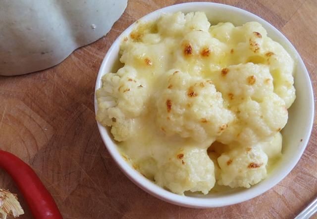 Coloca la coliflor en un refractario. Tape y cocine en el microondas durante 4-6 minutos a fuego alto, hasta que estén tiernos. Fuga.