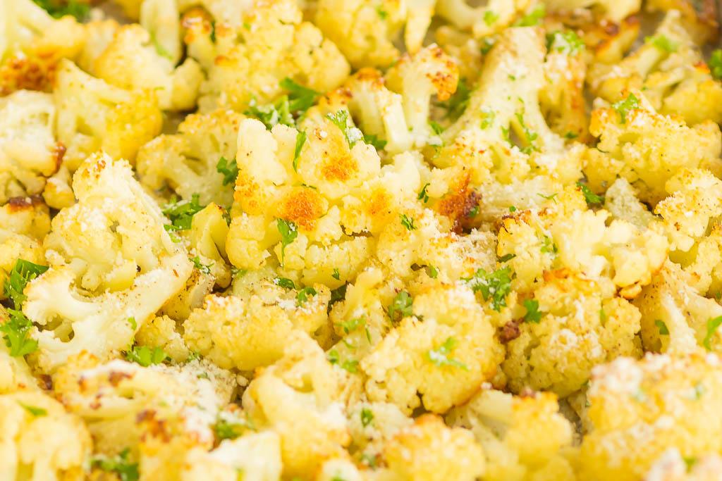 Esta coliflor con ajo asado está llena de sabor y está lista en solo 30 minutos. La coliflor fresca se sazona con ajo y una pizca de queso parmesano, lo que da como resultado un bocado crujiente. ¡Simple de hacer y perfecto para servir como guarnición fácil!