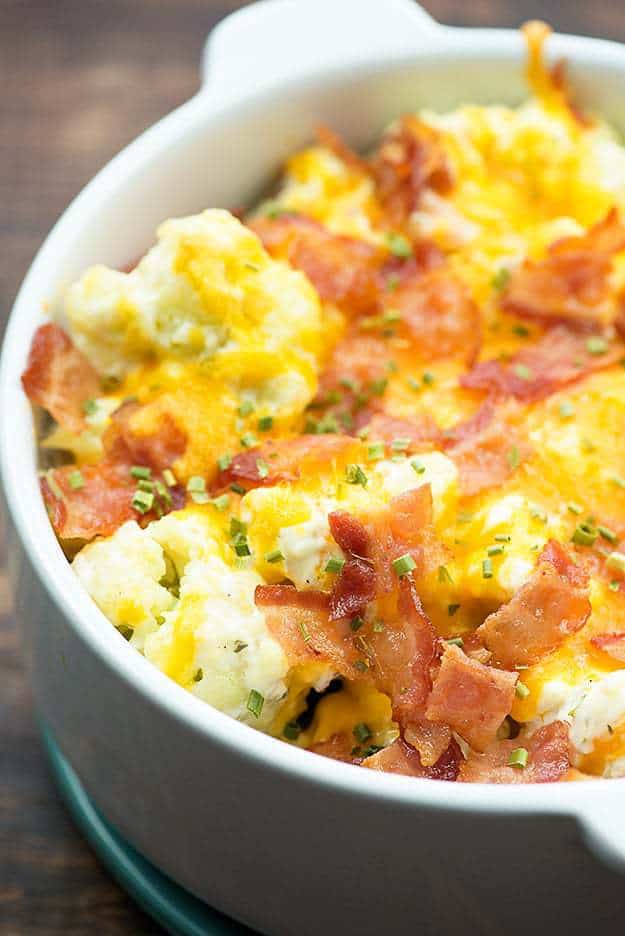 Este plato cargado de coliflor está relleno de queso, tocino y coliflor para una guarnición baja en carbohidratos que disfruta toda la familia.