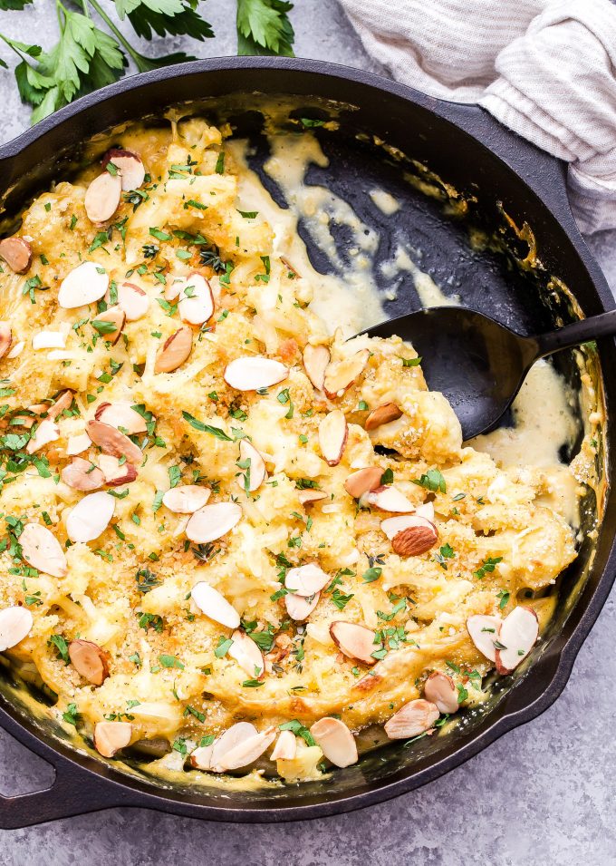 - Agregue los floretes de coliflor a la sartén y vierta la salsa sobre ellos. Cubra con queso vegano (si lo usa) y luego cubra con cobertura panko. Cocine durante 20-25 minutos o hasta que las burbujas y los condimentos estén dorados. Si la salsa no está lo suficientemente dorada, mete el horno en el horno y cocina por unos minutos más. Retire del horno y cubra con almendras picadas, perejil picado y tomillo fresco.