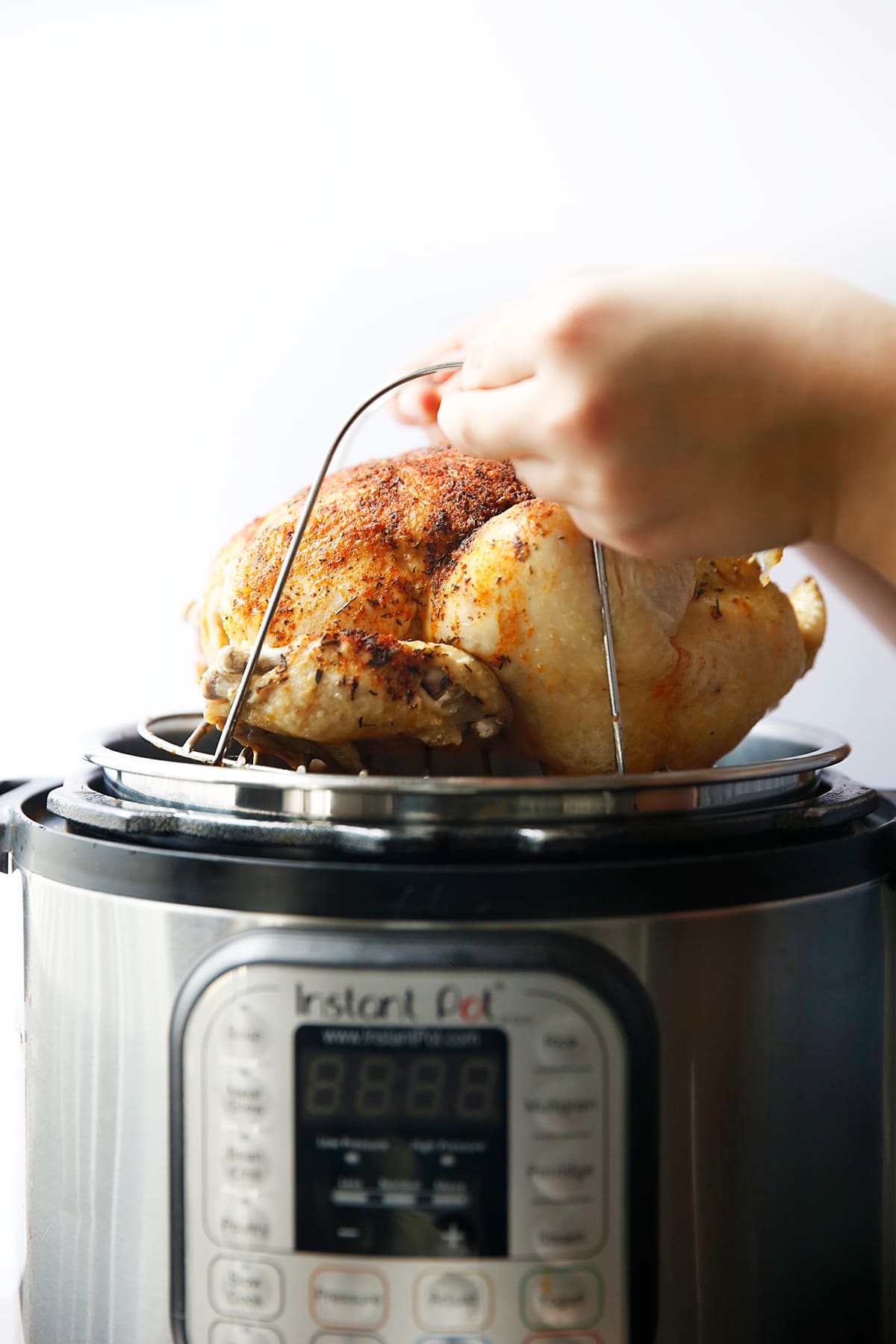 Sus como el miercoles y hoy vamos a hablar de: ¡Cómo cocinar un pollo entero en la olla instantánea! Los pollos asados que se encuentran en las tiendas de comestibles a menudo tienen un pollo tan jugoso y tierno, y ciertamente son asequibles, pero siempre nos encanta poder verificar los ingredientes en nuestra comida. Cuando cocine un pollo entero en Instant Pot usando nuestra mezcla de especias, será tan tierno y jugoso como un pollo asado entero comprado en la tienda. Es excelente para servirlo tal cual con guarniciones como puré de papas, ensalada de pepino con hierbas o zanahorias glaseadas con miel o puede usarlo para preparar comidas durante la semana. Puede convertirlo en una ensalada de pollo asado al rancho, sopa o salsa hummus de pollo asado.