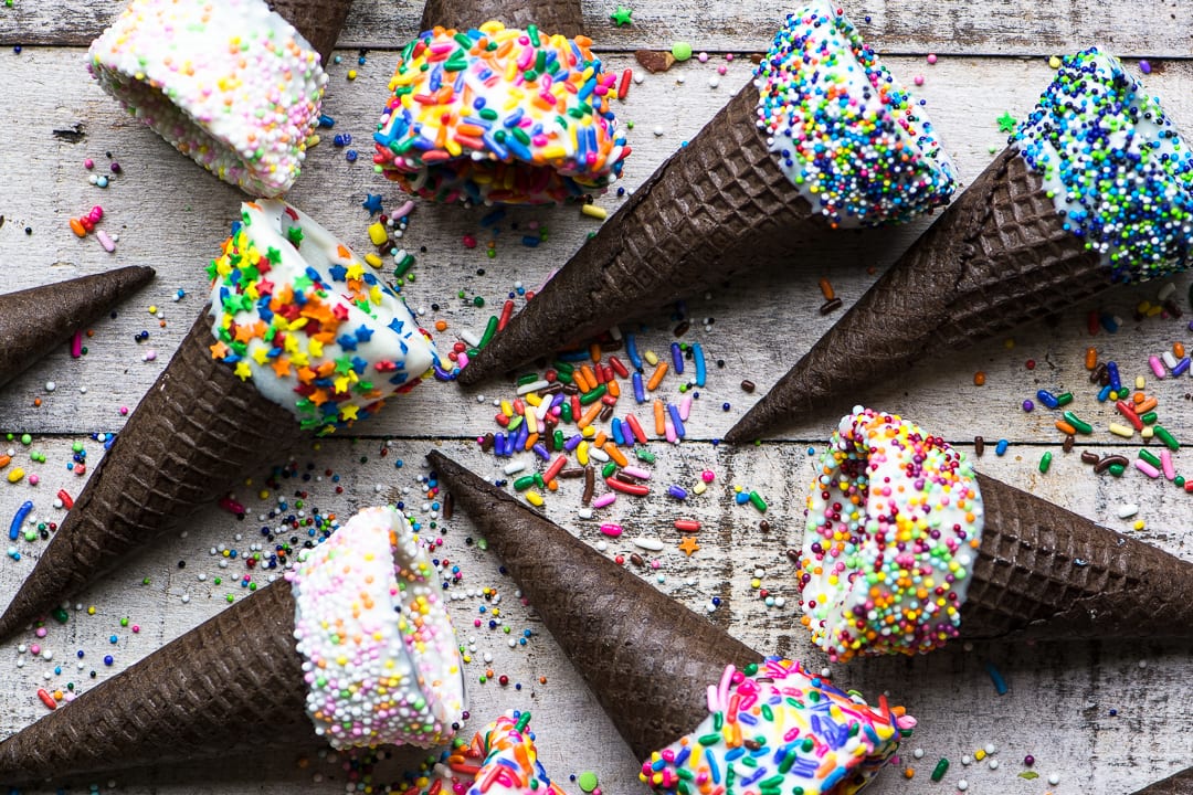 Conos de helado espolvoreados ~ Estos conos de chocolate están bañados en chocolate blanco y deslumbrados con chispas para los postres más bonitos del verano ~ ¡helado opcional!