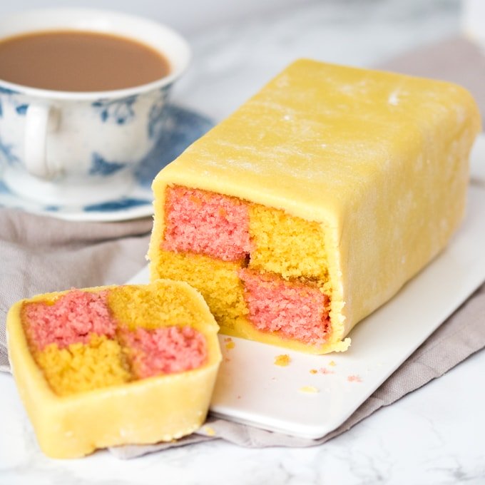 Battenburg: Un clásico inglés de suave rizo a cuadros intercalado con mermelada y envuelto en un espeso mazapán de almendras.