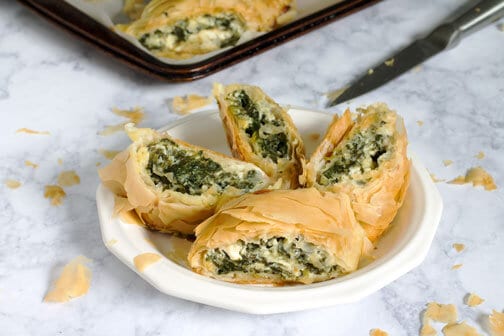 Este plato convierte ingredientes simples en algo irresistible. Las hojas de filo se untan con mantequilla, se apilan, se rellenan con una mezcla de espinacas y queso y luego se hornean.