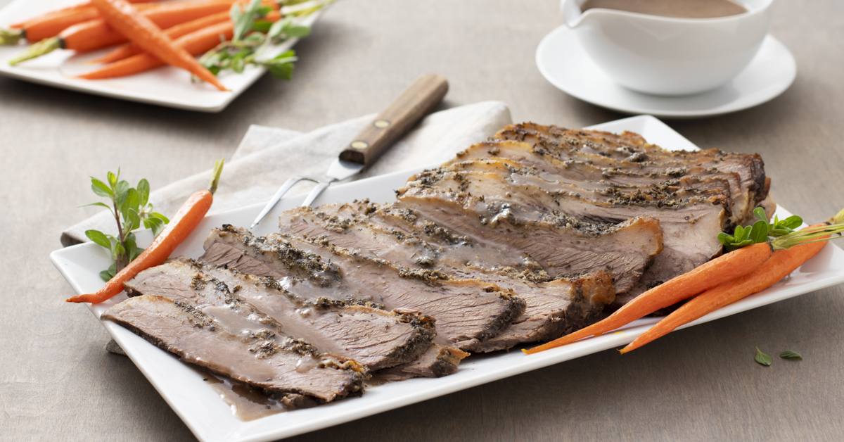 Según la Asociación de Carne de Ganado, la pechuga proviene de la pechuga de vaca o parte de la pechuga. Es un corte grande y deshuesado que pesa entre 8 y 20 libras, pero por lo general, cuando lo ves en la tienda o en el mostrador de carnes, ya se ha dividido en dos partes, el corte plano y el corte de punta. El corte plano es más delgado, aunque cubierto por una gruesa capa de grasa. También tiene una forma rectangular más uniforme. El corte puntiagudo es más acanalado, más grueso y ligeramente triangular. Técnicamente, puedes hacer un “cofre” usando cualquiera de los cortes, pero dado que es más fácil de encontrar y la forma uniforme facilita el corte, la mayoría de las recetas requieren un corte plano.