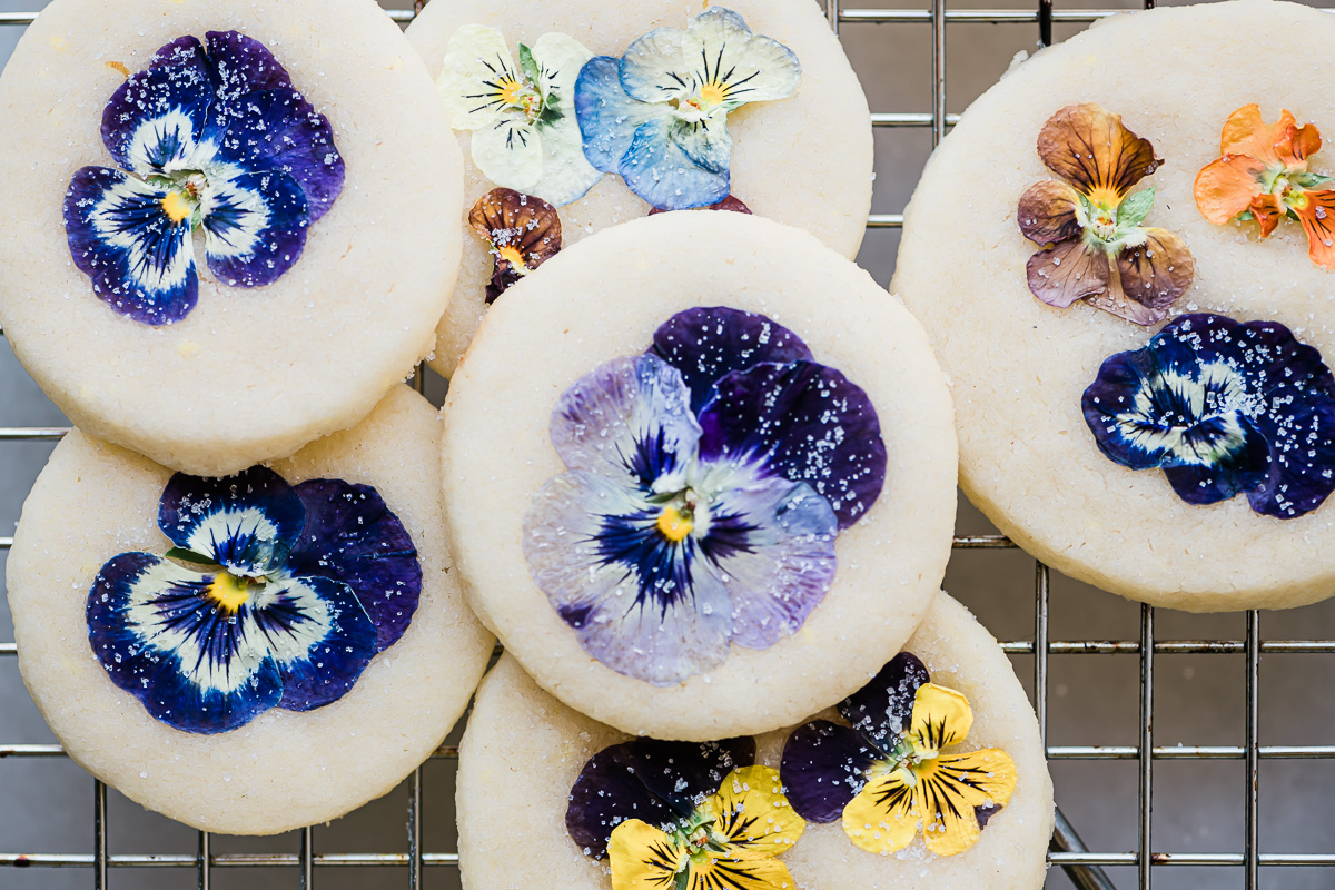 Yo hice galletas de hierbas que sigue siendo una de mis publicaciones más populares. Desarrollé una técnica para esta receta que consiste en enrollar o “rodar” hierbas frescas en la masa de mantequilla antes de cortar las galletas. La mayoría de las recetas de galletas cubiertas con flores comestibles involucran pegar las flores en un huevo batido y luego hornearlas. Este método da como resultado una capa blanca crujiente y poco atractiva en las flores. Y honestamente, ¡los pensamientos hervidos no son muy atractivos!