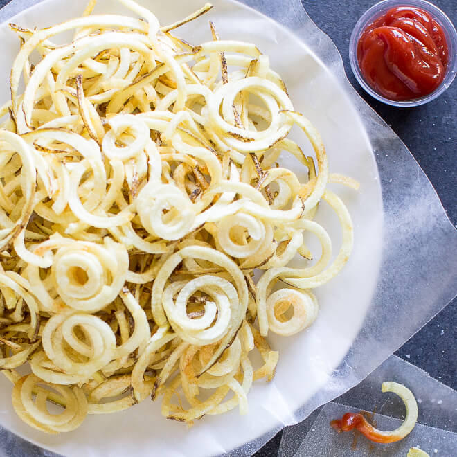 - Precaliente el horno a 200ºF. Caliente el aceite vegetal o de canola a 350ºF. Trabajando en lotes pequeños, seque algunas de las papas rizadas en un paño de cocina para eliminar el exceso de agua, luego vierta inmediatamente el aceite caliente.