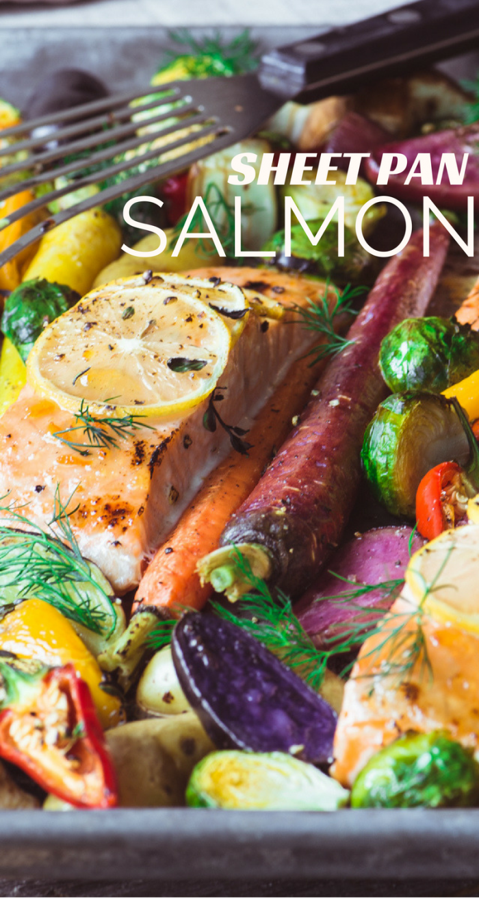 Para divertirme, usé verduras de invierno más coloridas como zanahorias arcoíris, papas fritas multicolores, pimientos, coles de Bruselas, berenjenas e incluso raíz de perejil para darle un toque de blanco. Evito las verduras súper densas como la remolacha y el calabacín porque tardan más en hornearse. Incluso con esta variedad, puse las verduras 10 minutos antes del salmón solo para darle una ventaja. Solo se necesitan unos 20 minutos para cocinar el salmón.