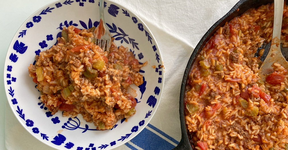 La adición de carne de res a este arroz es lo que lo eleva al nivel de valor de la empresa. Algunas versiones económicas usan papas en lugar de carne o solo salsa de tomate y pimienta en la mezcla. Pero esta receta tiene apio, pimientos verdes, carne de res y tomates enlatados para darle un sabor fuerte. Honestamente, si no tienes compañía, definitivamente puedes comerlo con una ensalada y llamarlo cena.
