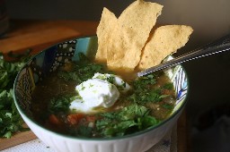 2 kilos de tomatillo, un pimiento verde enorme, 1 jalapeño, un puñado de cilantro, 3 limones y una pequeña tanda de cebollas verdes. 1 cebolla amarilla enorme, 2 zanahorias gigantes, una cucharada de semillas de apio (que es lo que uso cuando olvido como un genio comprar apio; para esta receta necesitarás media taza de apio picado), 2 y medio kilos de muslo de pollo (puedes usar pechuga de pollo, pero… no soporto la pechuga de pollo y la considero una tortura), un paquete de tortillas de maíz orgánicas y poco más de una cucharada de sal. Sí, es mucha sal, pero es mucha sopa.