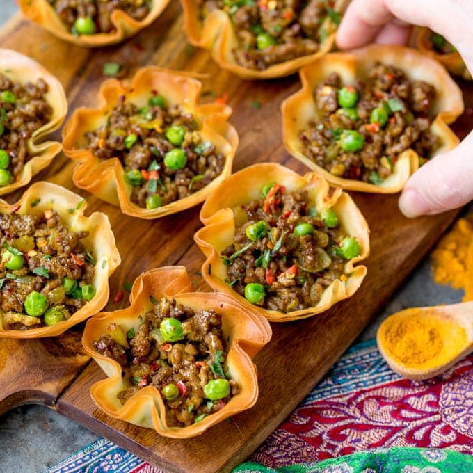 Decidí hacer estas pequeñas samosas abiertas con trocitos de cordero y pasta filo. Lo tripliqué con chile: usando chile fresco, hojuelas de chile en polvo. Sin embargo, solo usé pequeñas cantidades, por lo que deja un sabor delicioso, picante y picante en lugar de volverse loco. Puedes oscurecerlo o dejarlo por completo si lo prefieres.