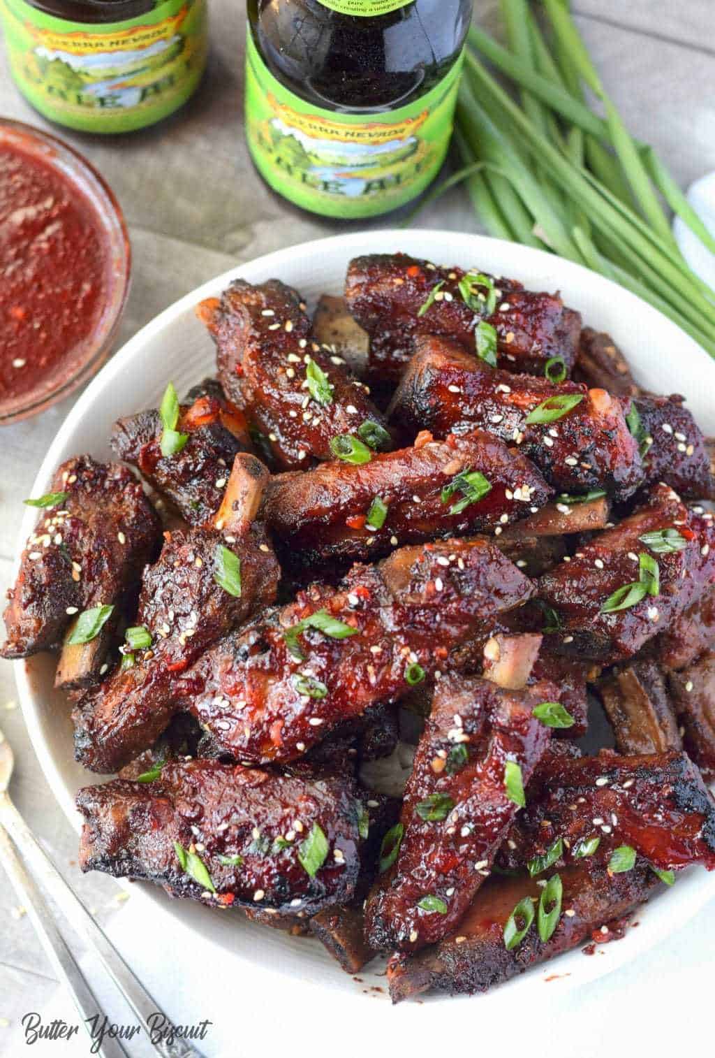 Al final de la cocción, retiré las costillas, saqué aproximadamente 1/2 taza de líquido y lo dejé enfriar durante unos minutos. Le añadí maicena al caldo frío para que no quedara grumoso y volví al caldo y batí bien. Encendió la olla de cocción lenta y devolvió las costillas al caldo. También agregué unas 2 cucharadas de salsa de soya y 2 dientes de ajo picado 1/2 hora antes de servir. Estoy seguro de que asar las costillas a la parrilla habría sido excelente, pero opté por mantenerlo simple y lo delicioso todavía estaba allí.