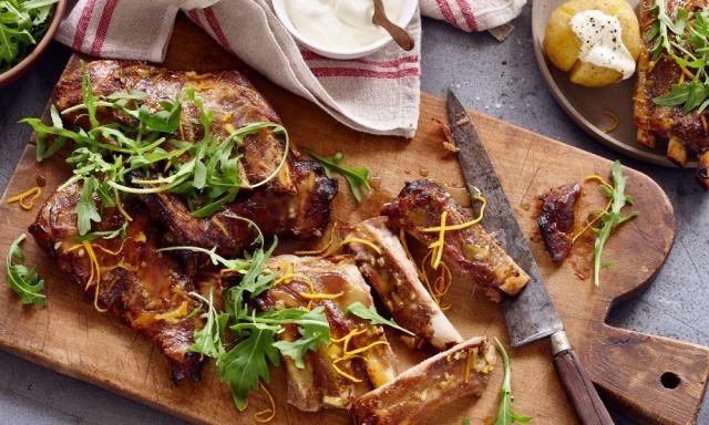 Precaliente una parrilla mediana-alta o una parrilla de carbón. Cocine las costillas, volteándolas ocasionalmente y untándolas con glaseado, durante 5 a 10 minutos o hasta que estén ligeramente carbonizadas y pegajosas.