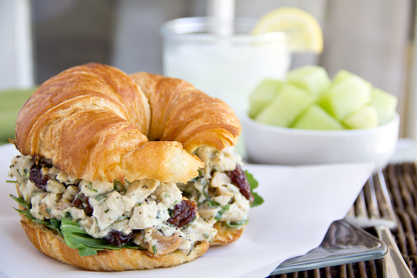Ensalada dulce y salada de pollo al estragón con anacardos tostados y cerezas secas en un croissant de mantequilla tostado