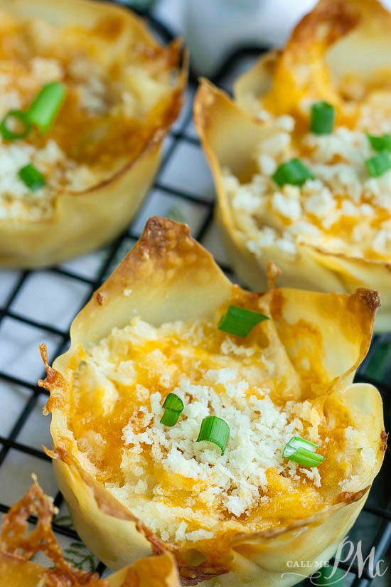 Crack Wontons utiliza ingredientes que te encantan y que probablemente ya tengas en tu despensa. Usé pollo asado, queso crema, queso cheddar y mezcla de condimentos Ranch y llené tazas de wonton con una cucharada de esta delicia. Completé la receta con más queso cheddar, panko y cebollín encima.