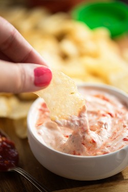 - En un tazón pequeño, mezcle la crema espesa y el sambal oelek hasta que estén bien combinados.