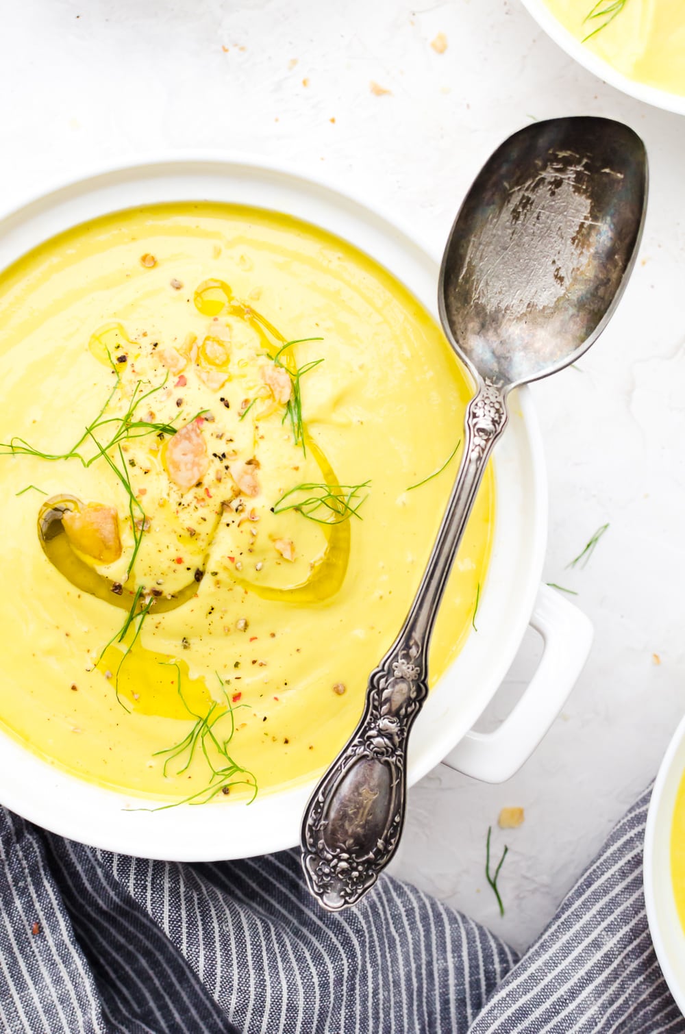 Al principio dudé un poco porque usamos mucho hinojo en la receta, que no era mi vegetal favorito en el planeta. Pero funciona sorprendentemente bien aquí en esta sopa. Estaba muy entusiasmado con el uso de la cúrcuma porque no usa la cúrcuma con frecuencia, además le dio a su sopa cremosa de coliflor un tono tan agradable.