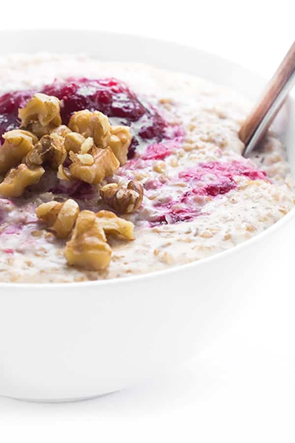 La estrella del espectáculo es la salsa de arándanos dulce y picante. Los arándanos están en temporada, lo que significa que los verá tanto en sus productos como en sus secciones de congelados. Solo toma 10 minutos cocinar con su líquido favorito (jugo de naranja o agua). Para mayor dulzura, uso azúcar moreno, pero el jarabe de arce también funcionaría. El resultado final está fuera de este mundo y es un buen cambio del tazón habitual de avena.