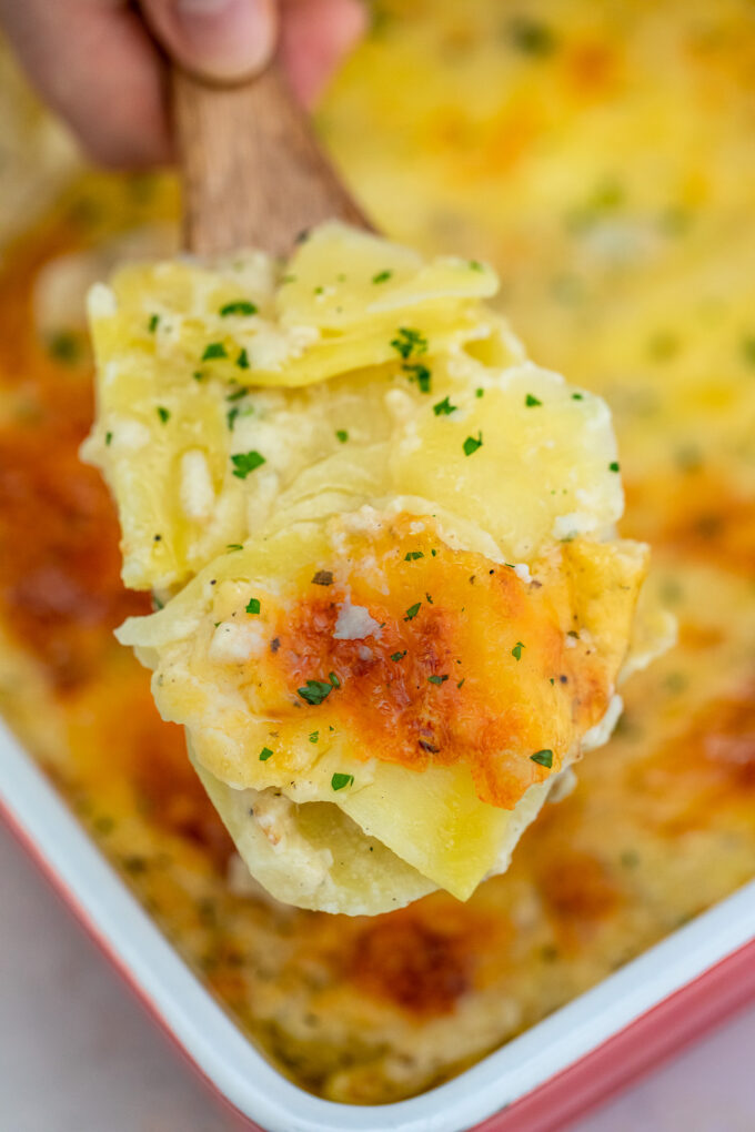 Potato Gratin combina sabores franceses e italianos en el plato de papa más delicioso, fácil de preparar y reconfortante. Patatas en rodajas finas se cocinan en una cremosa e irresistible salsa Alfredo.