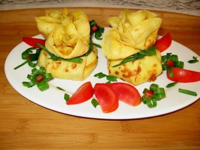 Coloque los panqueques fríos en un molde redondo más pequeño, como un molde para muffins, presione hacia abajo en el centro y mantenga los bordes del panqueque a los lados. Ponga algunas de las verduras en los panqueques. Poner un poco de bechamel sobre las verduras. Levantar los laterales y atar las tortitas con la parte verde de una cebolla tierna o chalota (ver foto).