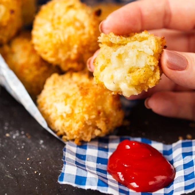Bien, hablemos de trozos crujientes de puré de papas con queso cheddar derretido en el medio, cubiertos con pan rallado crujiente. Creo que podría comer 50…