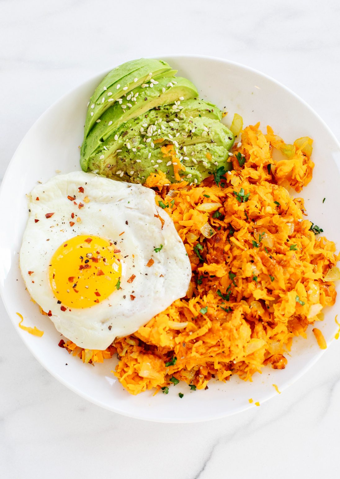 Yo lo combiné con huevo frito y aguacate, pero puedes echar este picadillo en una sartén fácilmente o incluso hacer empanadas con ellos ? Esta es solo una receta básica para cuando quieres algo rico cuando no tienes mucho tiempo para cocinar en el Mañana. A diferencia de la mayoría de los bloggers, todavía tengo un trabajo de tiempo completo fuera de los blogs, por lo que los desayunos rápidos son totalmente INCREÍBLES porque estoy constantemente saliendo corriendo (ni siquiera soy una persona mañanera, eh). ¡Esta receta es definitivamente una de mis favoritas y espero que disfrutes estos hash browns tanto como yo!
