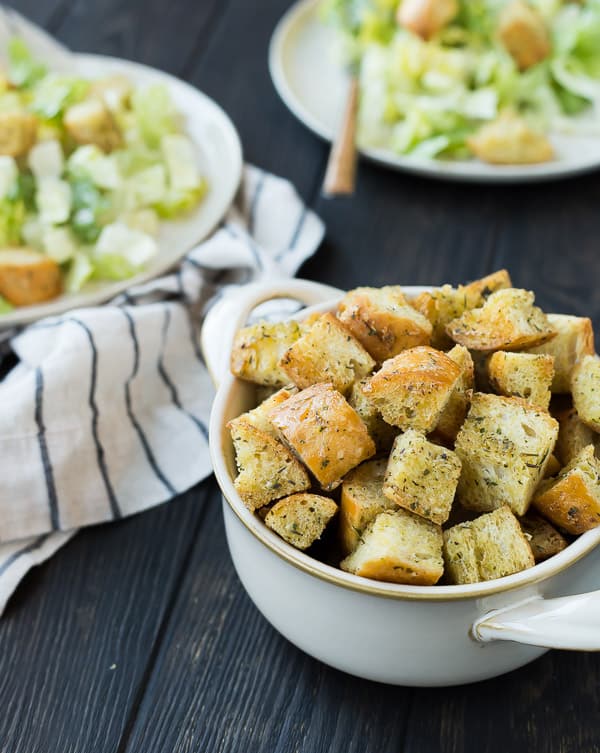 Al igual que todos los demás picatostes, los picatostes César son una excelente manera de usar las sobras o el pan duro si tiene uno en casa. Estos picatostes de parmesano y ajo están desmenuzados con hierbas y tienen mucho sabor para su ensalada César perfecta. Opté por el ajo en polvo para un sabor más suave, pero si eres un gran fanático del ajo, ¡siéntete libre de picar algunos dientes y enloquecer con el ajo!