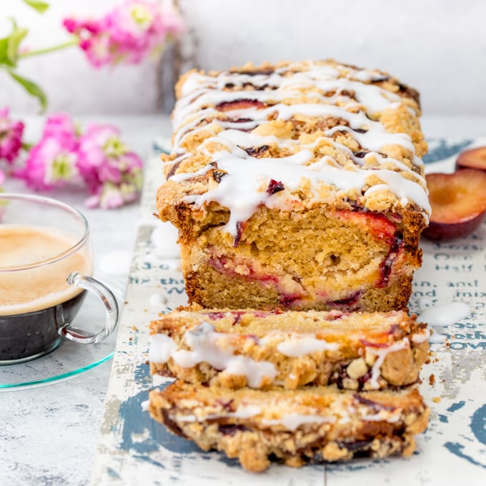 Plum Crumble Bread: ¡con una cobertura de streusel crujiente y mantecosa y una llovizna de almendras! ¡Un delicioso regalo para el brunch o el té de la tarde!