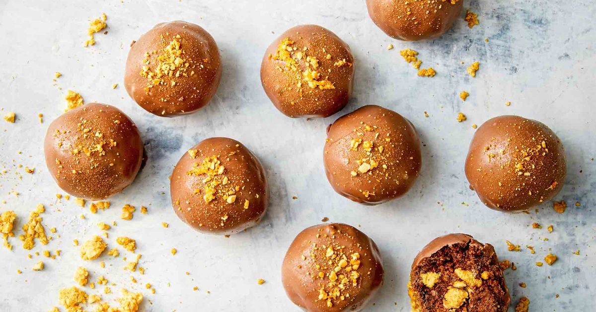 Con un tenedor, sumerja las bolas, una a la vez, en el chocolate derretido, dejando que se escurra el exceso. Regresar a la bandeja. Dejar reposar durante 2 minutos. Espolvorear con panal picado. Dejar reposar durante 30 minutos o hasta que esté hecho. Atender.