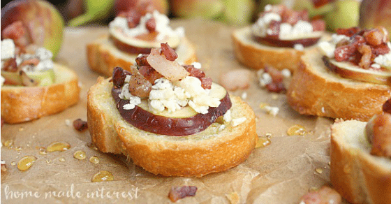 Este crostini de queso azul, higos y tocino es una receta fácil de aperitivo con el fuerte sabor del queso azul combinado con higos frescos y tocino salado en capas sobre una baguette tostada.