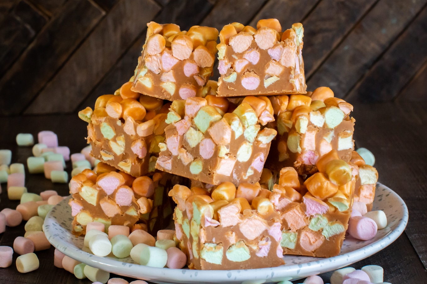 Un postre hecho de caramelo, mantequilla, mantequilla de maní y malvaviscos multicolores.