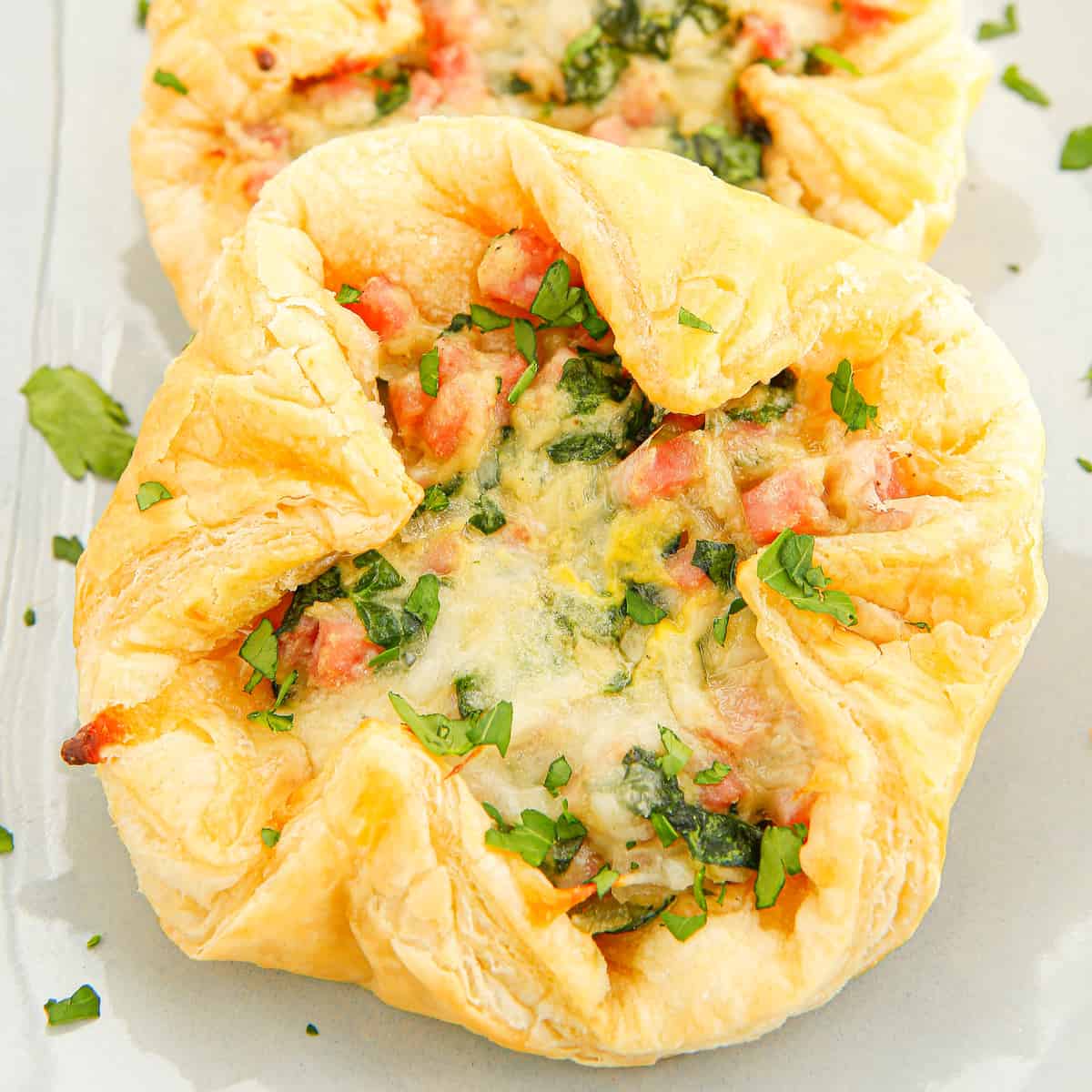 - Dobla las esquinas en el centro de cada cuadrado de hojaldre para formar un bolsillo encima del jamón y el queso.