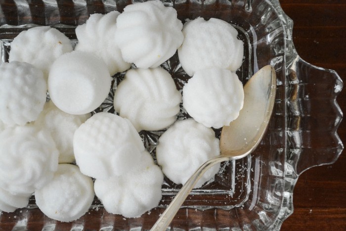 Me volví un poco loco y se me ocurrieron todo tipo de sabores, comenzando con limón y luego pasando a rosa, azahar, lavanda e incluso jazmín. La diversión que puedes tener es infinita. Pero creo que muchos de ustedes estarán felices con el azúcar blanco. La clave es humedecer muy ligeramente el azúcar con agua o el sabor que prefieras, luego presionarlo firmemente en un molde de plástico o silicona. Si lo deseas, puedes añadir un toque de colorante alimentario en pasta gel.