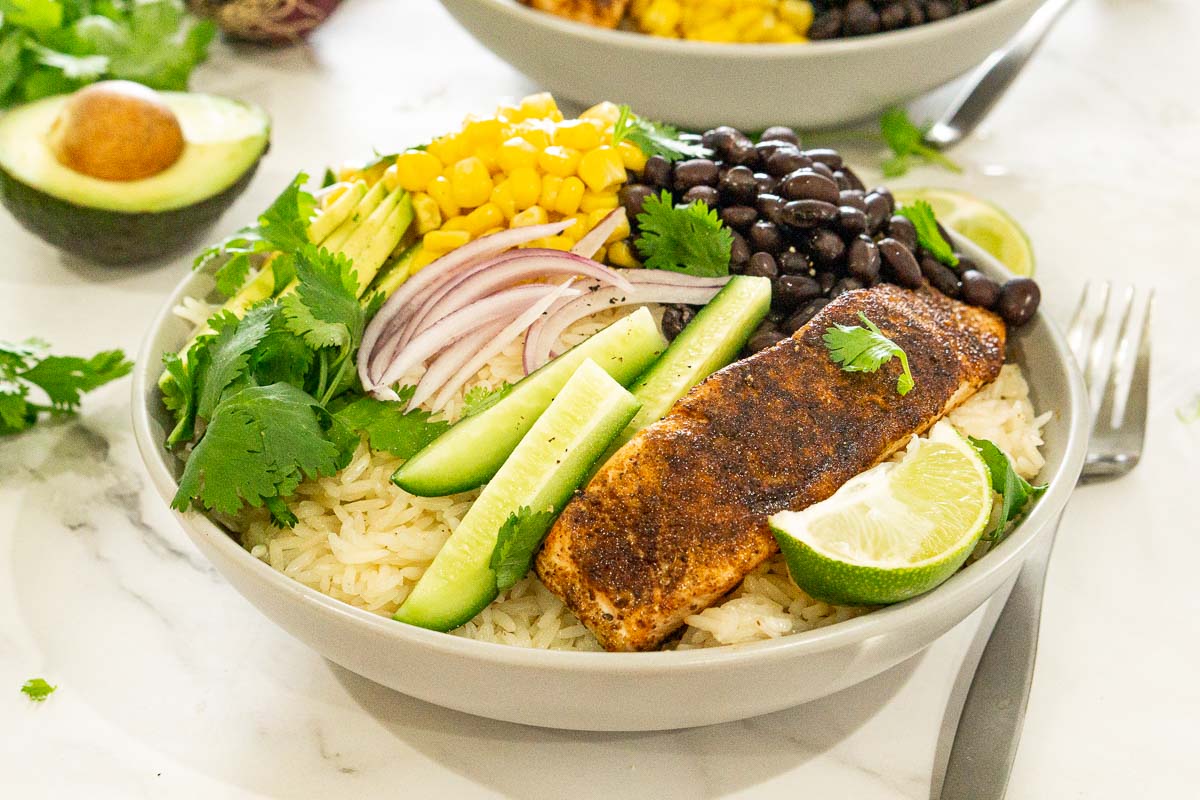 Listos en solo 15 minutos, estos tazones de arroz con salmón ennegrecido son súper sabrosos, abundantes y fáciles de preparar. ¡Una cómoda cena entre semana que es la favorita de la familia!