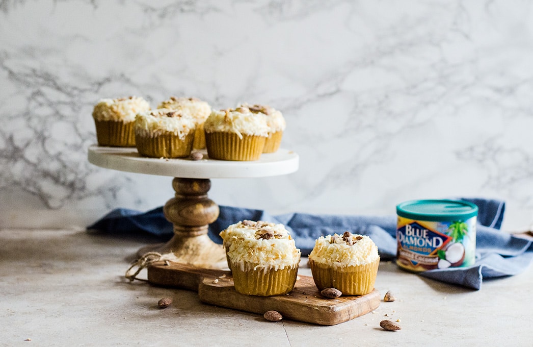 Estos cupcakes de coco son uno de mis favoritos. Tiene un delicioso sabor a coco con mucha textura de coco rallado tostado y topping de coco crujiente Blue Diamond Almonds. También agregué una mezcla de coco rallado y tostado a la masa de cupcakes. Al igual que mis galletas de chocolate y coco, bate la mantequilla con azúcar de coco para infundir el sabor del coco. También me gusta agregar un toque de extracto de coco a mis cupcakes porque realmente quiero que el sabor a coco esté al frente y al centro, pero los cupcakes de coco saben muy bien sin él.