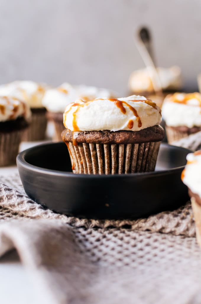 Tomé un pastel de calabaza favorito que hice y le agregué un trago saludable de espresso para lograr un dulce equilibrio de cálidas especias otoñales y toques de café. Para terminar los cupcakes, no quería hacer un glaseado tradicional para estos cupcakes de leche y café con especias de calabaza. En cambio, quería darle una sensación más ‘lechosa’ usando un glaseado de crema batida al que le agregué un poco de queso crema para mayor estabilidad y sabor. Luego, por supuesto, está la llovizna de caramelo. Puedes usar todo el caramelo que quieras, pero para estos cupcakes en particular usé el caramelo de cerveza fría que tenía de Fat Toad Farm para amplificar el sabor del café con un giro más.