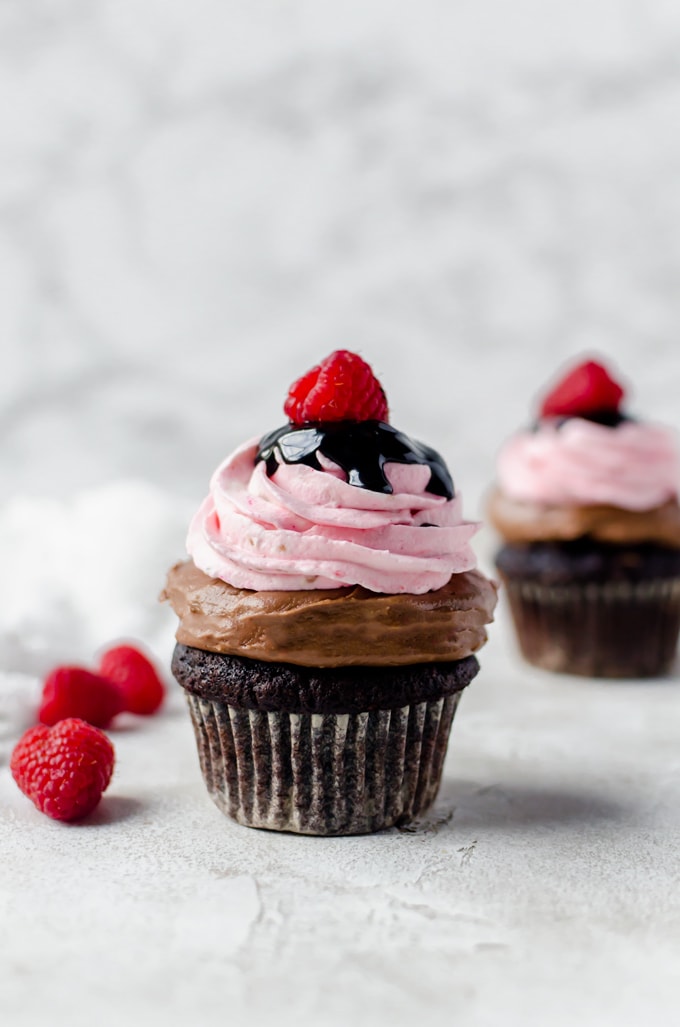 Estas magdalenas de chocolate con Nutella lo son todo. Empecé con mi base de muffins de chocolate favorita, que es ligera y húmeda. Chocolate, pero no demasiado indulgente. Luego lo cubrí con una cobertura cremosa de Nutella que es tan buena que no hay palabras para describirla. Además, agregué un generoso remolino de crema batida de frambuesa que es tan aireada y liviana que puedes comerla con una cuchara. Las frambuesas son ligeramente dulces sin azúcar agregada, por lo que todo el cupcake no era increíblemente dulce. Finalmente, hay una llovizna de chocolate y una frambuesa fresca.