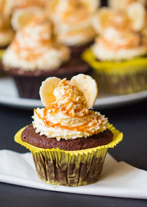 Dado que estos cupcakes están cubiertos con crema batida, deben comerse de inmediato o pueden refrigerarse en un recipiente hermético durante unos días. Si vas a hacer esto, no coloques el plátano en rodajas encima hasta justo antes de servir. . La información nutricional es por cupcake.