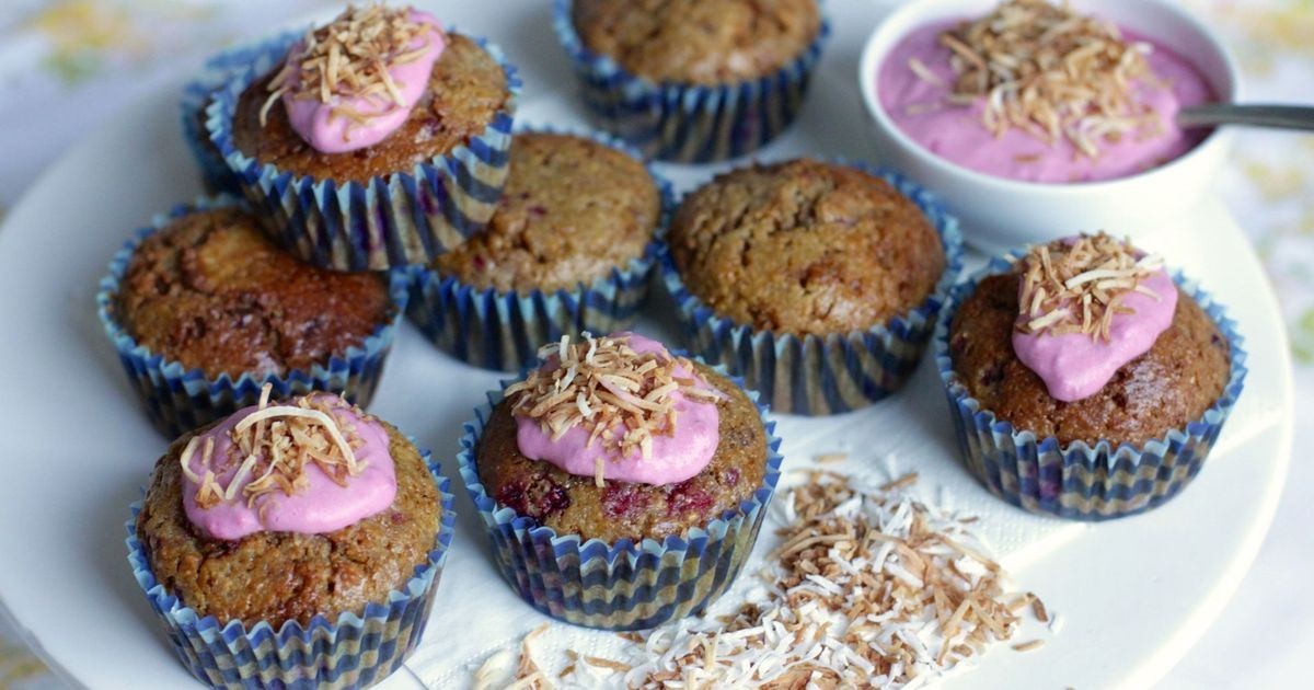Sirve los cupcakes con una cucharada de crema de frambuesa y coco y una pizca de coco rallado tostado.