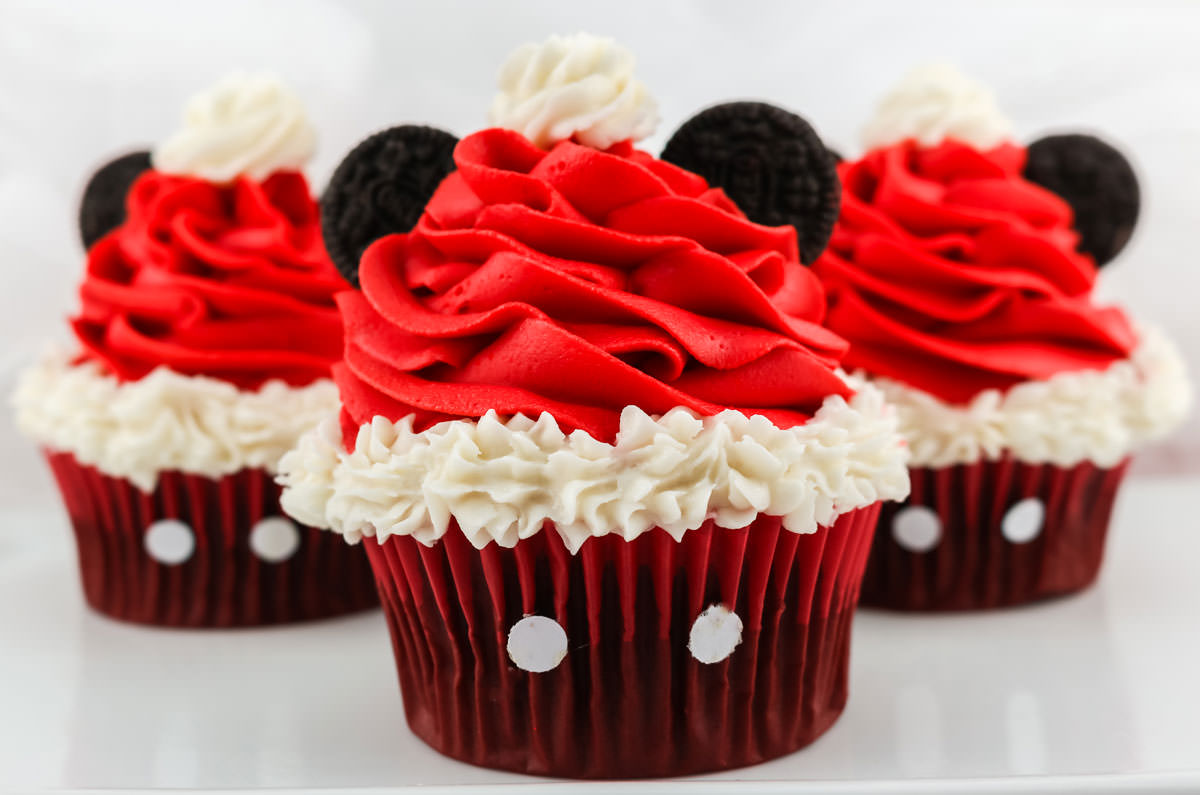 Paso 5: Recoge tus cupcakes. Usamos un forro rojo.Paso 6: Con una manga pastelera y una boquilla Wilton 1M, mezcle un poco de glaseado rojo Best Buttercream: este es el “sombrero”.Paso 7: Ahora necesitará una boquilla para decorar Wilton #22 Star. Usando el glaseado blanco, crea un círculo de glaseado alrededor del sombrero de glaseado rojo.Paso 8: Agregue una pequeña cantidad de glaseado blanco en la parte superior del sombrero de Santa. Coloque dos Mini Waffles de Galletas Oreo en la Cubierta para Orejas de Mickey. Y luego use los puntos de pegamento para unir los puntos blancos en el forro rojo de la magdalena a los botones de Mickey Mouse.