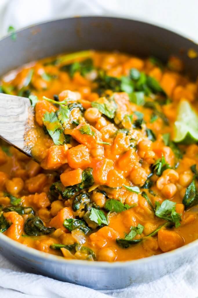 El curry es un plato nativo de la India que utiliza una mezcla de especias y hierbas como la cúrcuma, el comino, el cilantro y el jengibre. ¡Así que son geniales para la dieta antiinflamatoria! Por lo general, se hace en una salsa como este curry de camote.