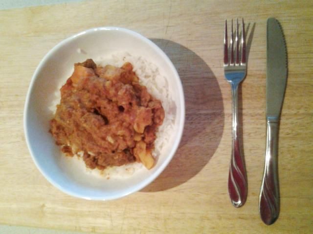 Sirva el curry con arroz al vapor, raita, pappadam y chutney de mango.