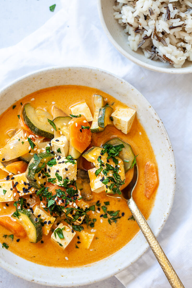 ¡Un curry de tofu amarillo vegano de inspiración tailandesa está listo en la mesa en menos de 30 minutos! Súper fácil y delicioso.